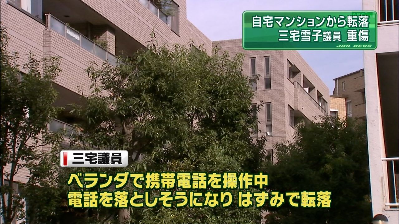 民主党の三宅雪子衆院議員(45)が東京都港区の議員宿舎のベランダから転落し、腰の骨を折る重傷を